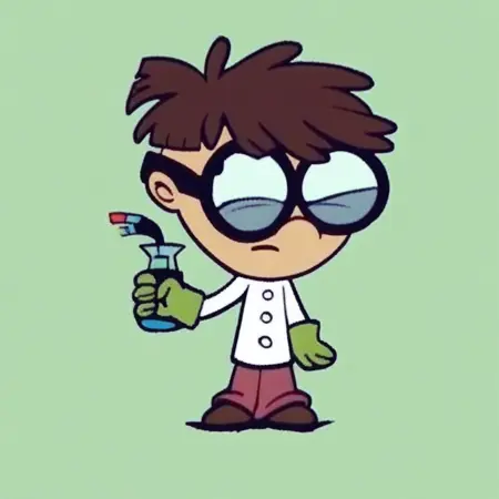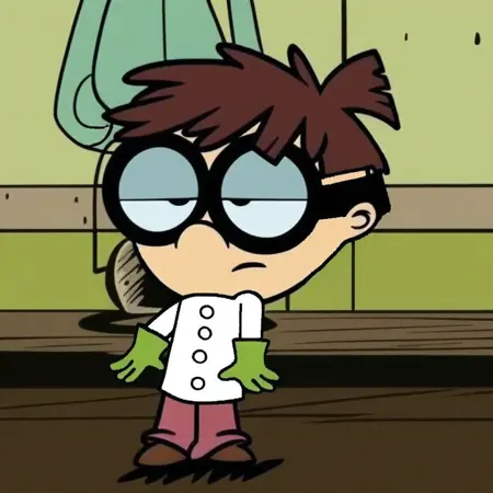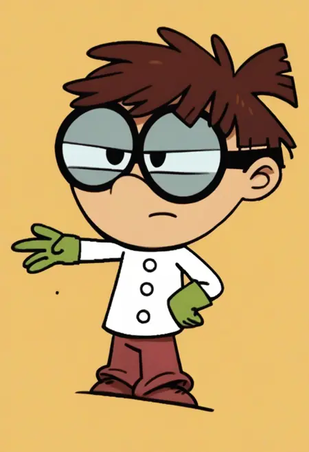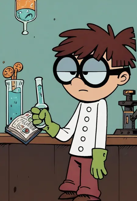 프롬프트: Levi Loud, solo, 1boy, Brown hair, glasses, science lab coat, Green gloves, dark pink pants
