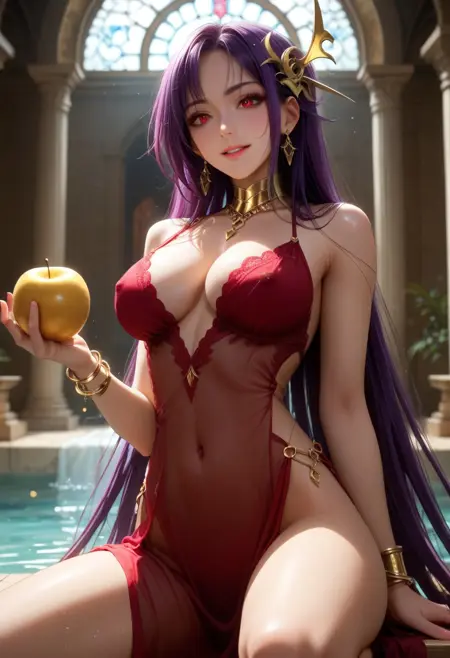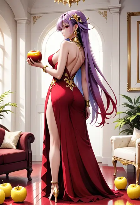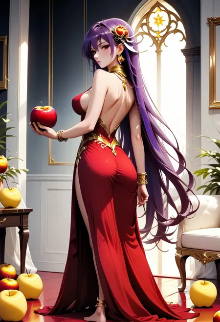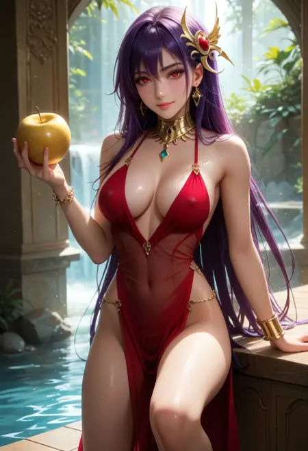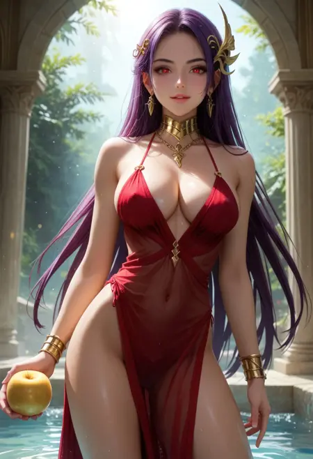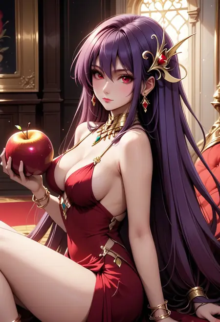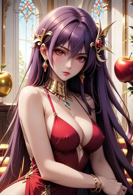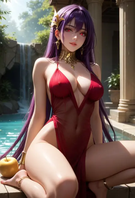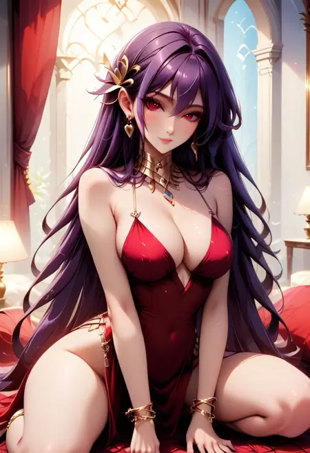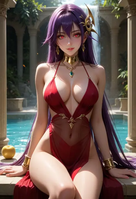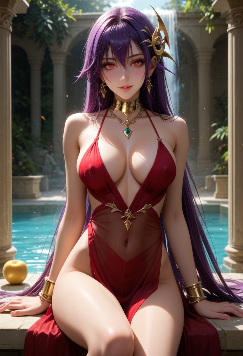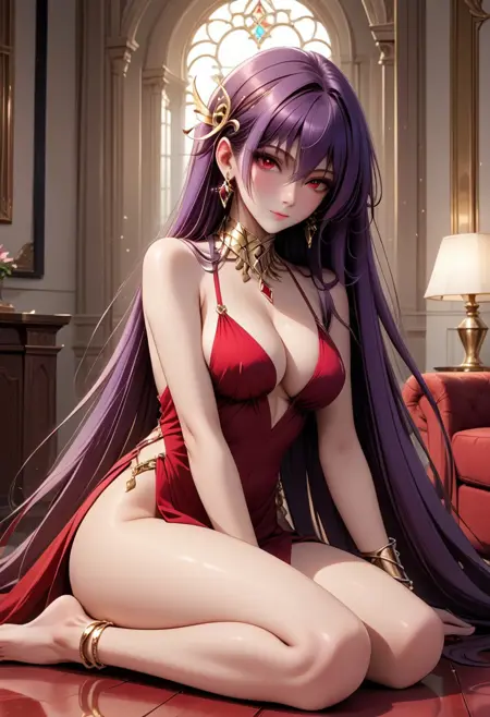 Eris_Santia_Sho,1girl,solo,very long hair,purple hair,bare shoulders,red eyes,breast,cleavage,red dress,jewelry,hair ornament,earrings,choker,anklet,armband,thigh slit.