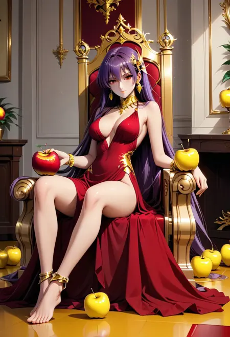등부분 네크라인, 골든 벨트, 보라색-금발 머리, 골든 애플, 골든 아머, 왕좌