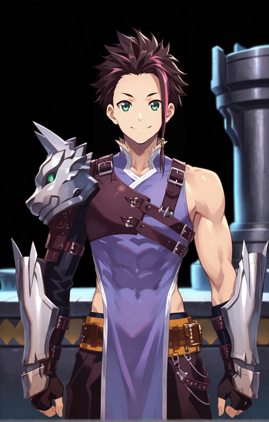 purple clothes, fingerless gloves, black gloves, gauntlets, armor, black pants, shoulder armor, sleeveless, single pauldrons, buckle,