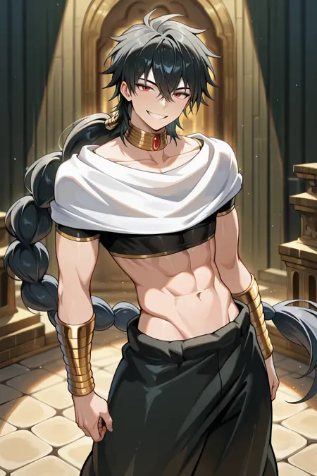 judaL, single braid, black hair, red eyes, bangs, long hair, hair between eyes,