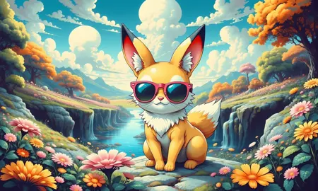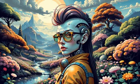 #yourSubject, dpDreamWorldアートスタイル、鮮やかなグラデーションを用いた超現実的で夢のようなデジタルアート、ファンタジーな雰囲気、豊かな色使い、芸術的なサイケデリックイラストスタイル、滑らかでシャープ、川と花々のある素晴らしい自然の背景