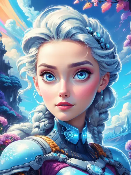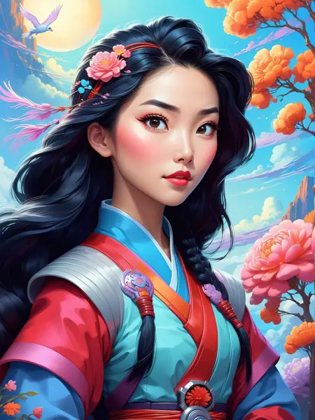 #yourSubject, dpDreamWorld 아트 스타일, 생동감 있는 그라디언트와 환상적인 분위기를 가진 초현실적 꿈꾸는 디지털 아트, 풍부한 색상, 예술적인 심리적 일러스트레이션 스타일, 매끄럽고 선명하며, 강과 꽃이 있는 뛰어난 자연 배경