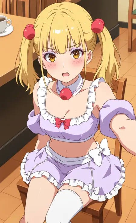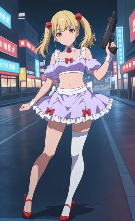 1girl,ak1bama1dma1dl11enm0b1,애니메이션 컬러링,솔로,갈색 눈,노랑 눈,(아이섀도우:0.9), 트윈테일, 블론드 헤어,(작은 가슴:0.8), 중간 크기 가슴, 헤어 볼, 크롭탑, 복부, 프릴, 프릴 스커트, 퍼프短袖, 분리된 칼라, 단축 팔, 빨간 리본, 분리된 소매, 흰색 허벅지 양말, 단일 허벅지 양말, 보라색 스커트, 어깨 노출, 야외, 도시, 미소, 최고 품질, 마스터피스, 민감한, lora:AkibaMaidMaidlienMob12:0.95