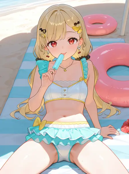 flower ear pendant, necklace, frilled bikini, frilled layered skirt,靴/鞋子/Footwear: