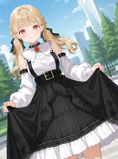 low twintails, medium hair, black hair ribbon, oval ear ornament,服/衣服/clothing: