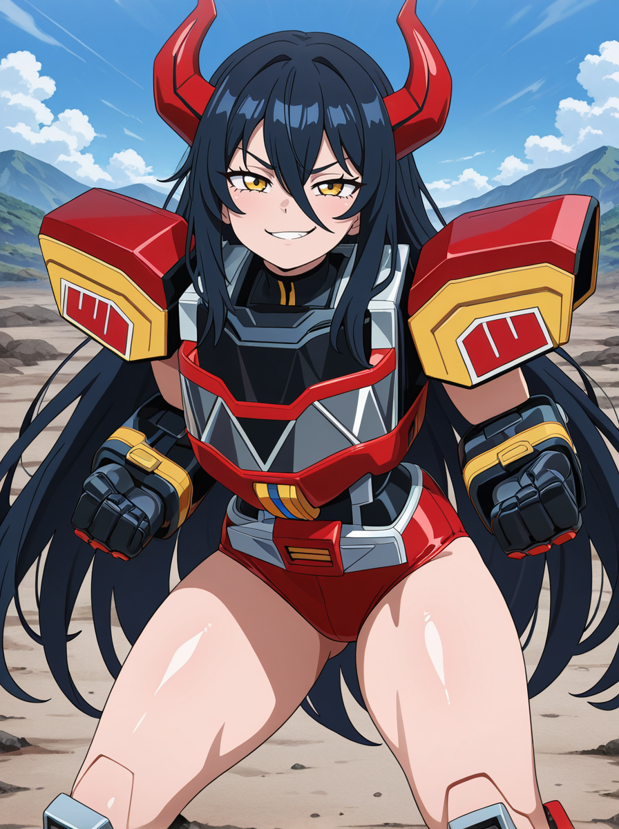 프롬프트: 메카 빨간 뿔, 솔로, 노란 눈, 검은 어깨 패드 갑옷, 로봇, 마스크
