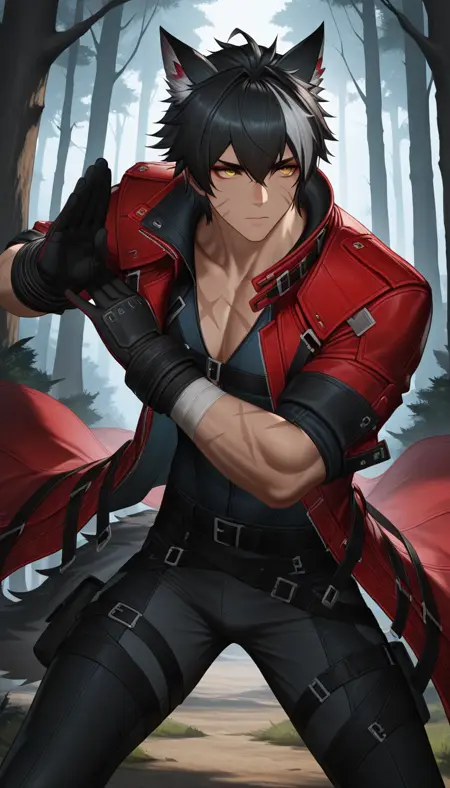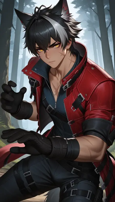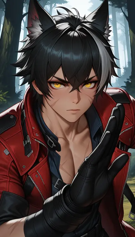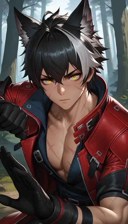 랑웨이, 검은 머리, 늑대 귀, 노란 눈, 다색 머리, 빨간 코트, 가슴 노출, 흉터, 장갑,