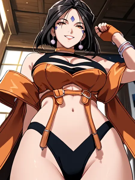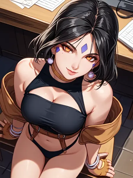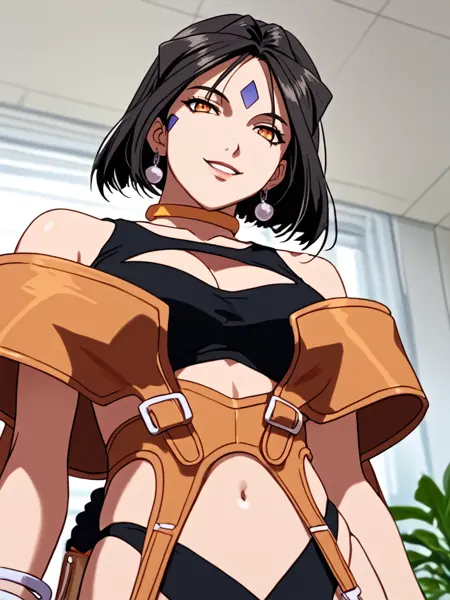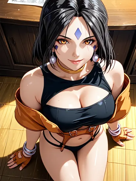 facial mark,forehead mark,short hair,black hair,orange eyes,large breasts,cleavage,midriff,black panties,cleavage cutout,fingerless gloves,earrings,bracelet,bare shoulders,thighs,choker,