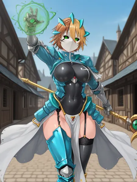 Ex-Sonya, 1girl, blonde hair, brown hair, bicolor hair, short hair, green eyes, black leotard, white loincloth, one armored leg, white boot, black thighhighs, garter_straps, blue jacket, blue armor, white frills, skin tight, silver_gauntlets, white gauntlets,