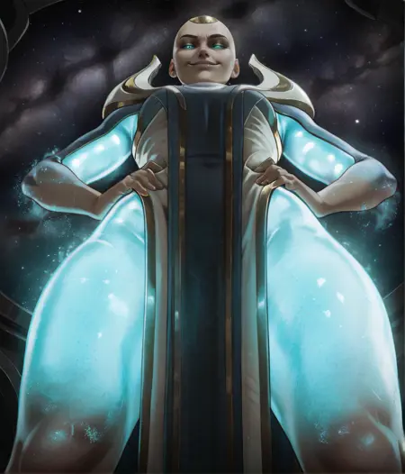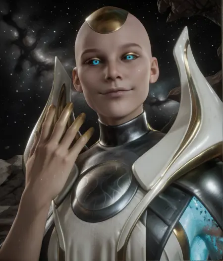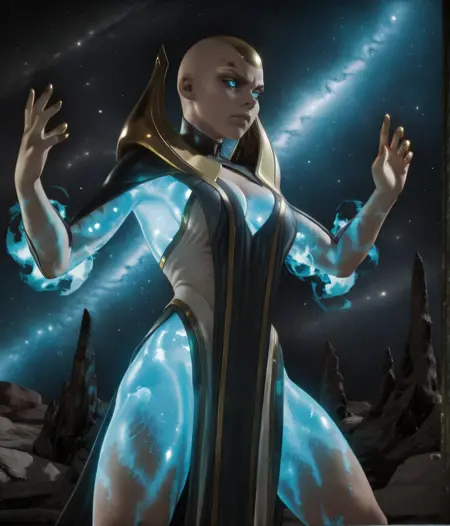 Kronika, blue eyes, black sclera, or glowing blue eyes, bald, freckles, gold eyeshadow,