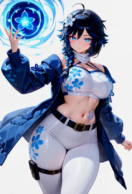 1girl, 青い目, 長い髪, 黒髪, 青髪, 多色髪, 二色髪, 片方の編み込み, 編み込みポニーテール, 髪が肩にかかる, ahoge, 前髪, 大きな胸, 腹部のタトゥー, (太ももが太い:1.2), 広いHip,