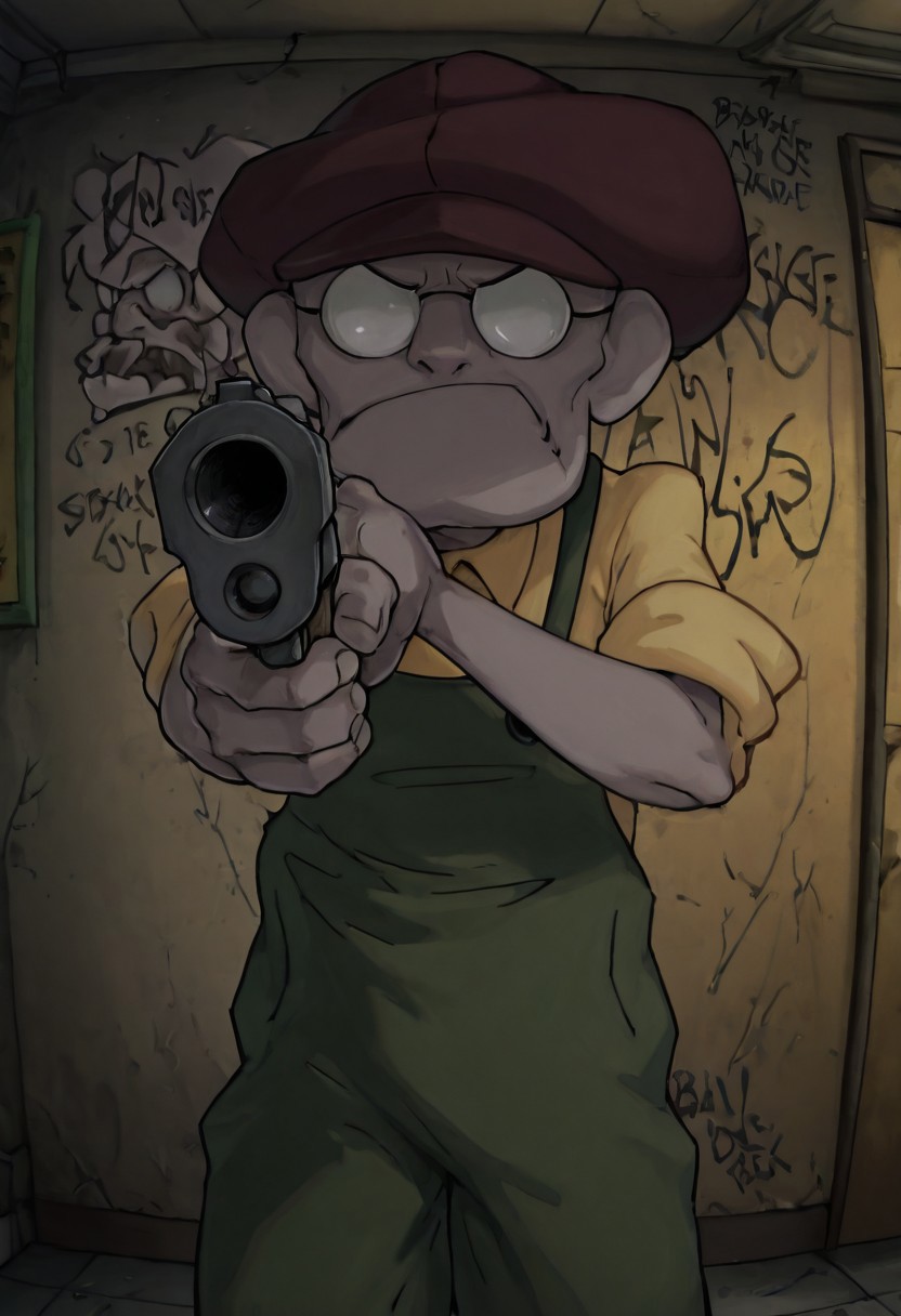 Green overalls, yellow shirt, hat, glasses, grumpy expression,
