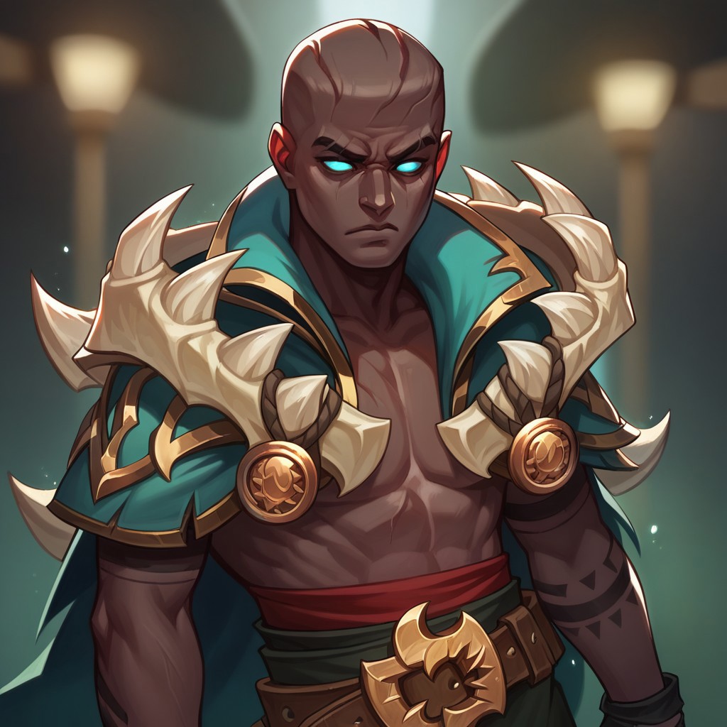 복장 프롬프트: 망토, 뼈로 된 어깨 패드, 벨트, 바지, 부츠, 손가락 없는 장갑,