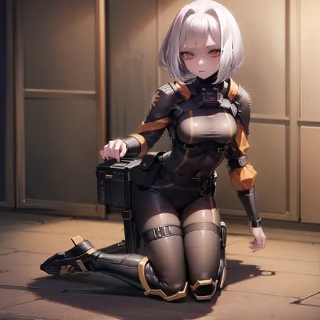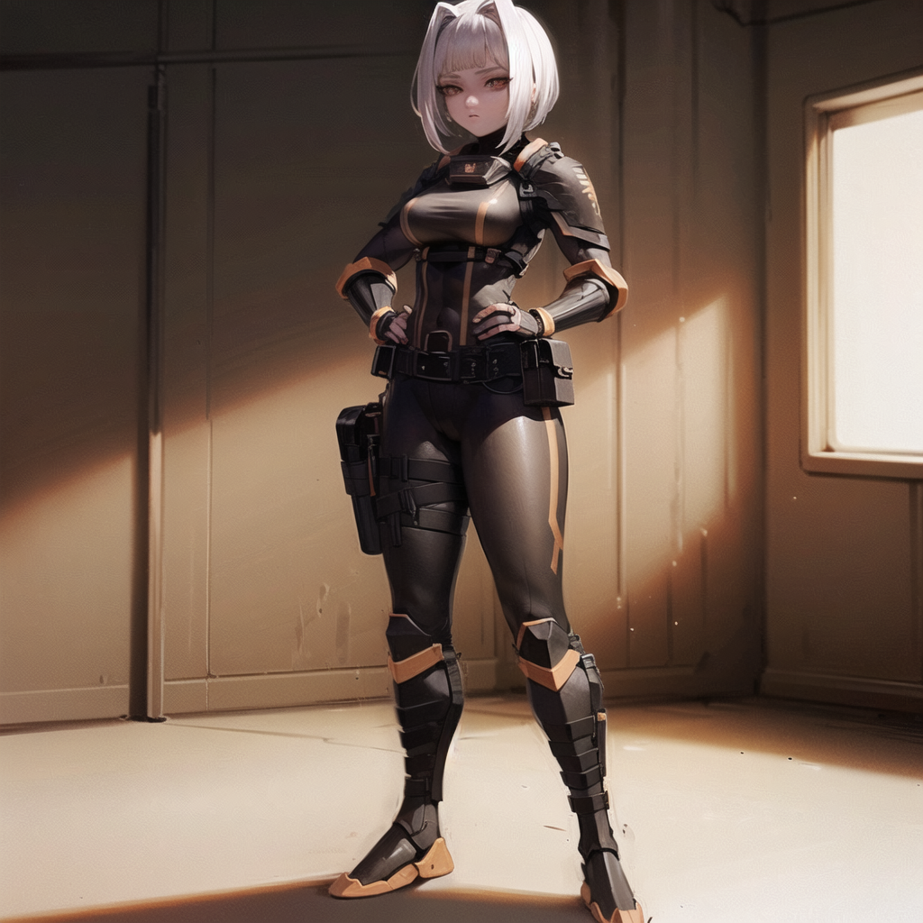 a girl dressed in black and orange outfit with short hair, 1girl, solo, short hair, white hair, full body