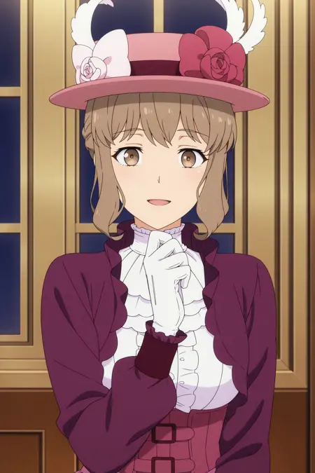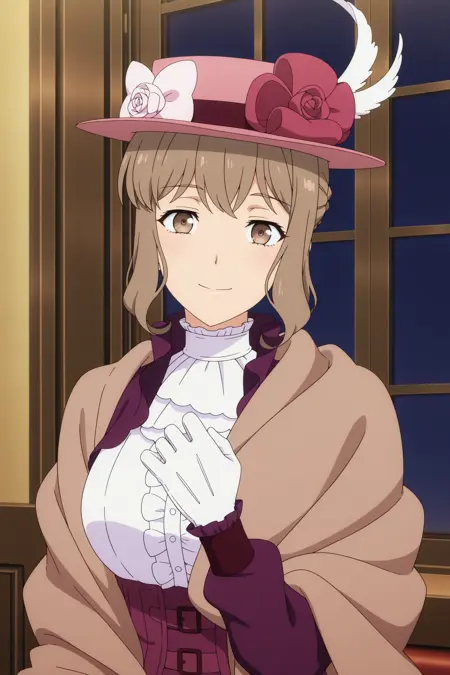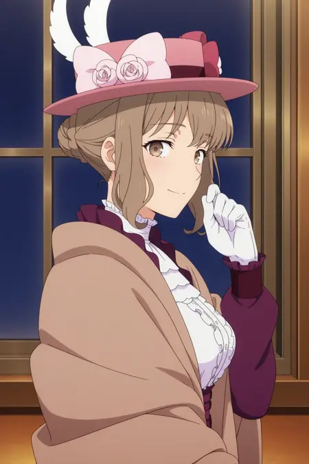 amelia ruth, short hair, brown hair, single hair bun, sidelocks, brown eyes, pink hat, boater hat, hat flower, victorian, long sleeves, purple jacket, white shirt, white gloves, brown scarf, long skirt, purple skirt, pink skirt, two-tone skirt, high-waist skirt, lace-trimmed skirt