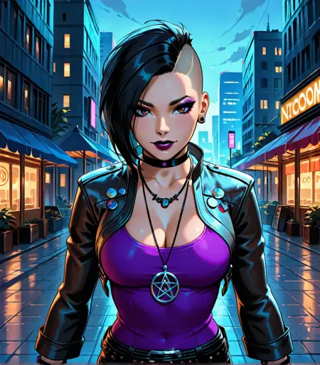 masterpiece,best quality,amazing quality,upper body,solo, Asian woman, nice eyes , high quality,nicomino++, nicogamelook, leather jacket, purple top, half-shaved hair, 1girl, asymmetrical hair, jewelry, breasts, makeup, solo, bracelet, choker, cleavage, earrings, black hair, necklace, lipstick, belt, jacket, eyeshadow, pants, leather, undercut, dark lights, city++, science fiction