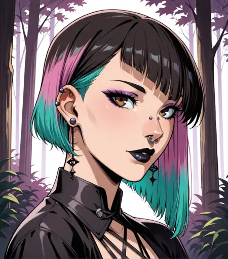 masterpiece,best quality,amazing quality,upper body,solo, Asian woman posing in strong way, nice eyes , high quality,nicomino, nicoaltlook++, nico bob, multi-colored hair, dark lipstick, black dress, 1girl, solo, black lips, nose piercing, earrings, jewelry, short hair, piercing, looking at viewer, multicolored hair, brown eyes, white background, makeup, upper body, simple background, lip piercing, dark lights, forest++, science fiction