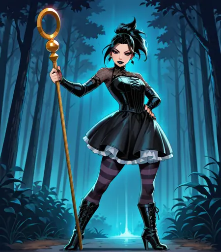 masterpiece,best quality,amazing quality,upper body,solo, Asian woman posing in strong way, nice eyes , high quality,nicomino, nicostandardress, gothic, corset, stripped socks, dark lipstick, 1girl, solo, striped, jewelry, earrings, StaffOfone , striped+ pantyhose, black hair, pantyhose, boots, black nails, gothic dress, nail polish, hand on hip, high heels, makeup, high heel boots, lipstick, ponytail, corset, holding staffofone, dark lights, forest background, science fiction