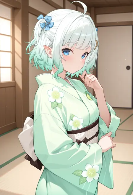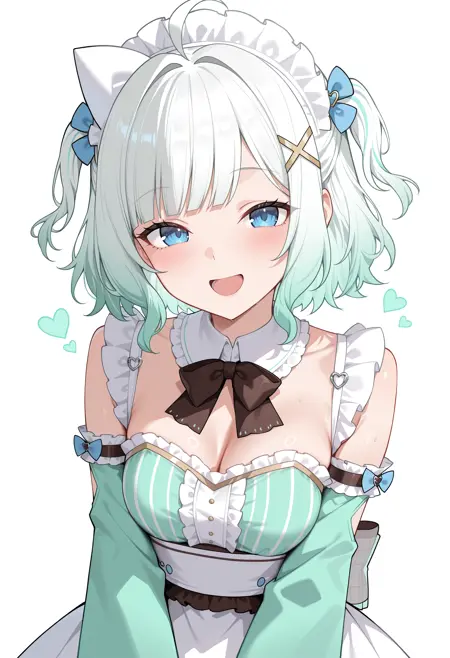 mint fantome, pointy ears, multicolored hair, gradient hair, blue eyes, ahoge, green hair, white hair, short hair, hair ornament, bow, two side up