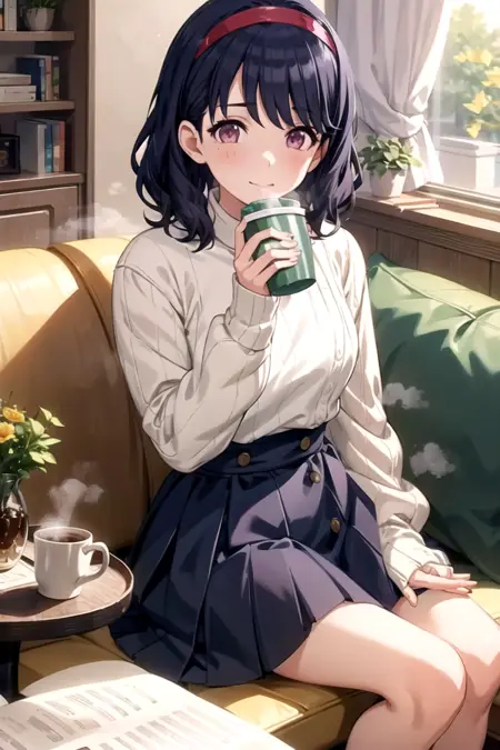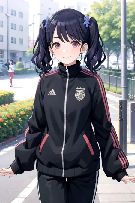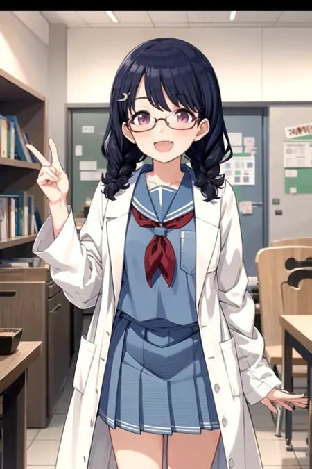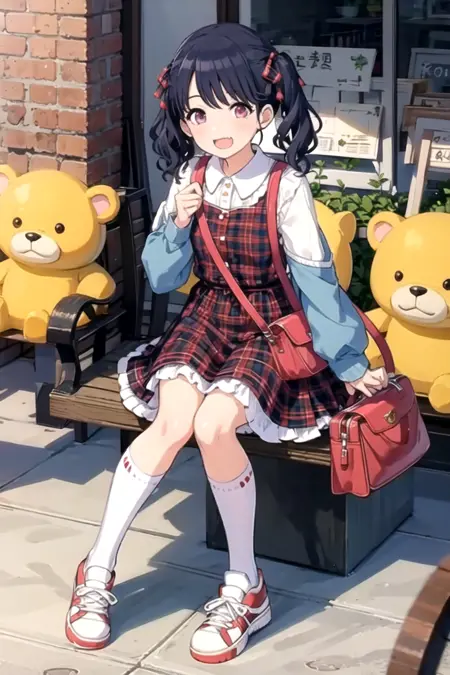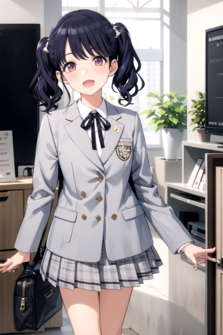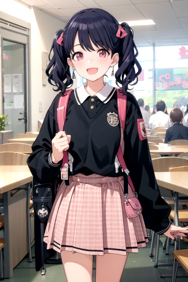 koitosc, 1girl, solo, black hair, twintails, purple eyes, skin fangs, fangs