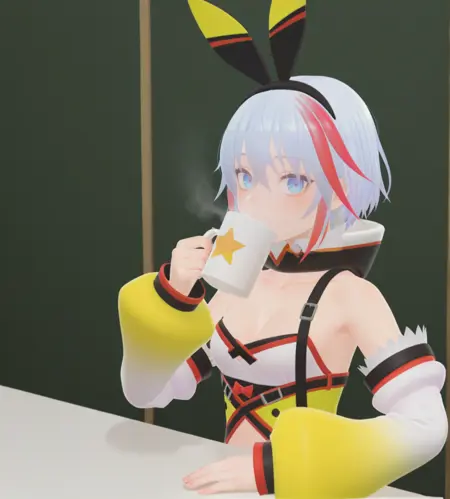 衣装:取り外し可能なカラー、ユニタード、テールコート、複色の服、肩出し、オフショルダー、ストラップ、胸元、お尻の割れ目、取り外し可能な袖、長袖、黒いパンツタイツ、黄色のブーツ、
