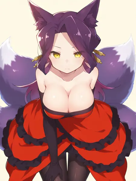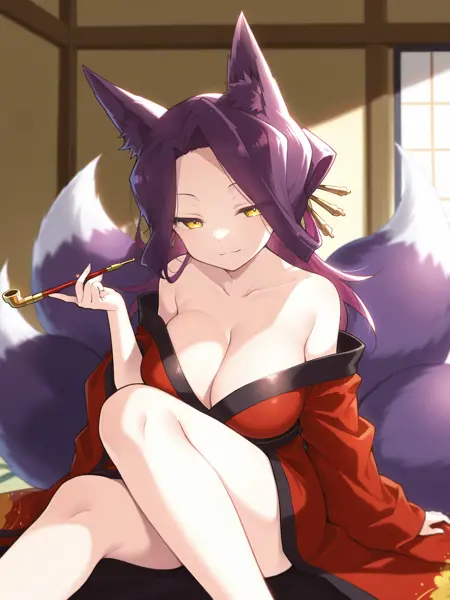 Apperance: ilsora, purple hair, long hair, yellow eyes, fox ears, fox tail, multiple tails, hair ornament, large breasts