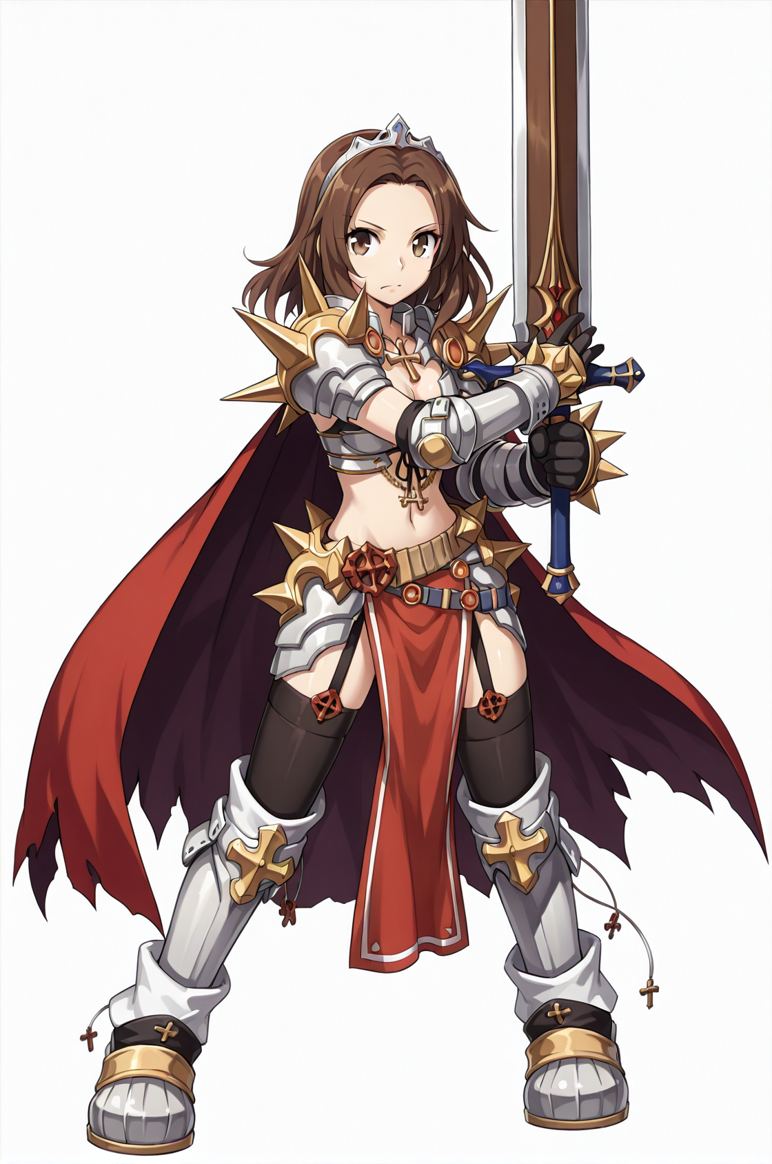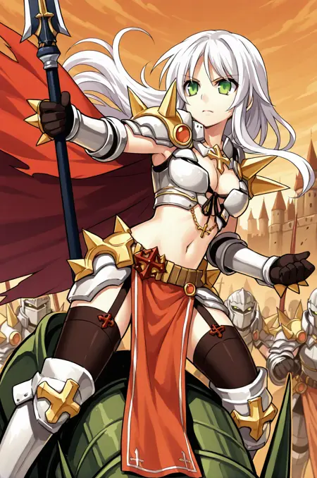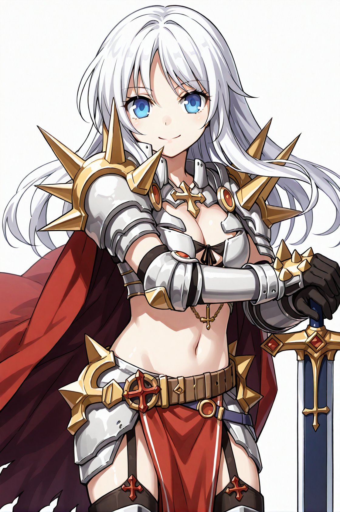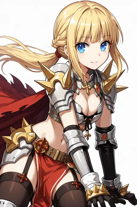 prompt: runeKnightRO, 装甲连衣裙,装甲裙,肚脐,腹部,吊袜带,护手,珠宝,肩甲,斗篷,腰带,红色破烂斗篷,红色骨盆帘,腰布,十字项链,肩部尖刺,前系上衣,胸甲,黑色手套,前臂甲,装甲靴