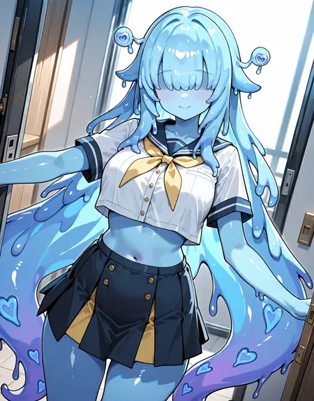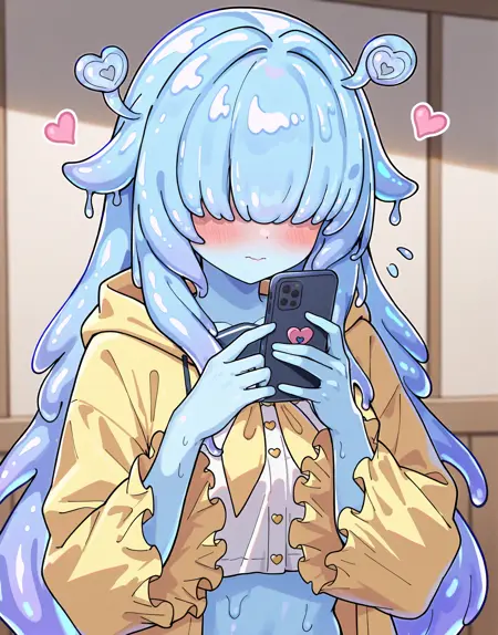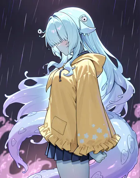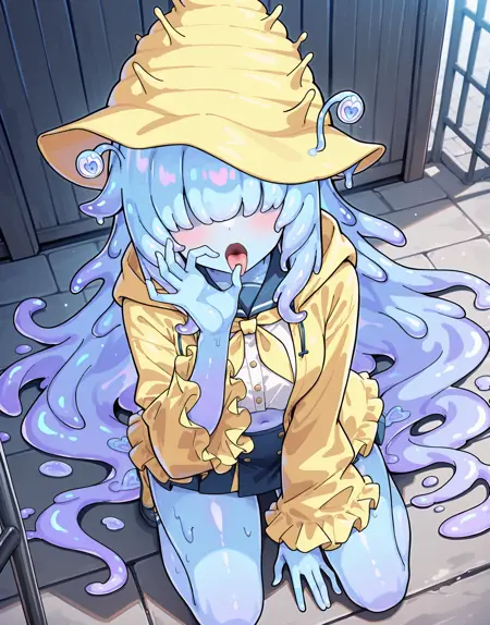 squirmimi, no eyes, slime girl, hat, raincoat,