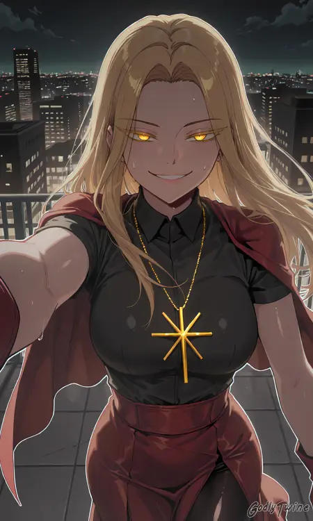 Victoria, yellow eyes, blonde hair, long hair, yellow eyelashes, necklace, red cape, red high-waist skirt, red fingerless gloves, black pantyhose, black collared shirt, short sleeves
