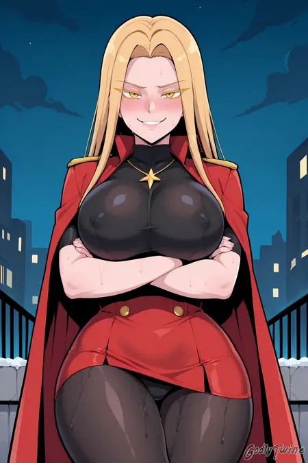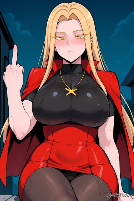 Victoria,yellow eyes,blonde hair,long hair,yellow eyelashes,necklace,red cape,red high-waist skirt,red fingerless gloves,black pantyhose,black collared shirt,short sleeves