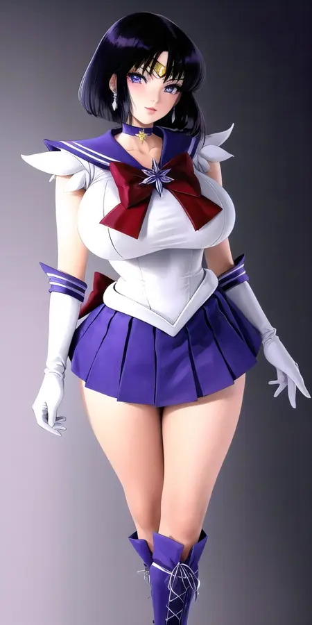 Sailor_saturn_Purple_sailor_collar_Purple_skirt_Maroon_bowtie_Maroon_back_bow_Purple_choker_Purple_boots_circlet:一般的なサターン衣装。ファンアートを使用して作成したため、スター要素が混ざっている可能性があります。