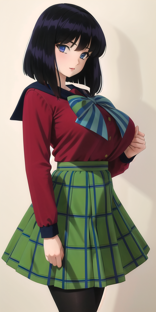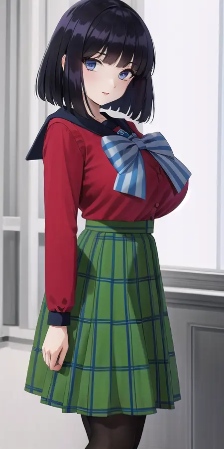 Mugen_School_Uniform_Black_sailor_collar_Red_shirt_Green_skirt_Black_pantyhose_Blue_striped_bowtie:無限学園の制服です。