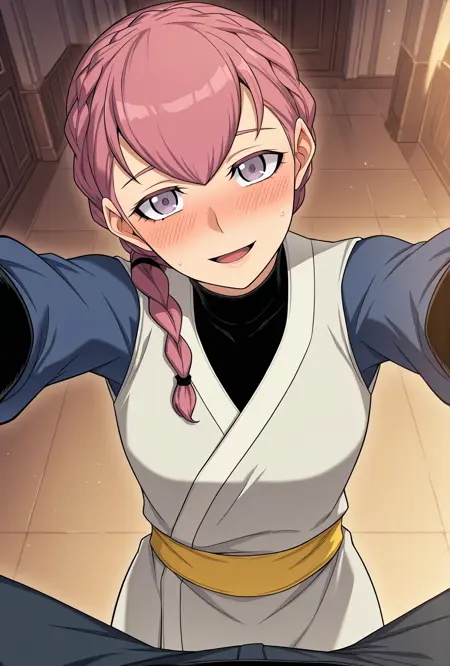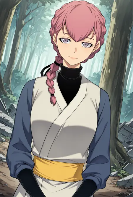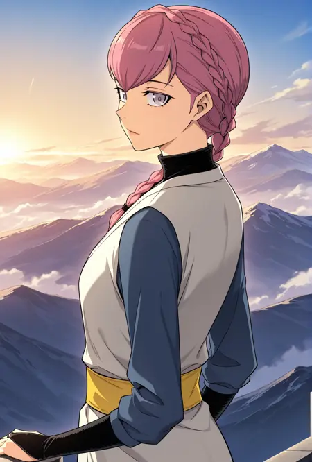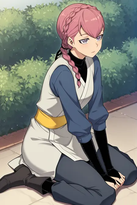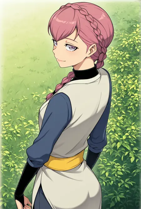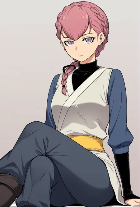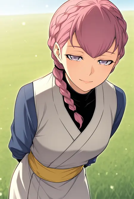 Nora, 1 girl, solo,purple eyes, braided hair, single braid, blunt bangs, hair between eyes, long hair, pink hair,