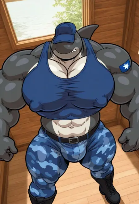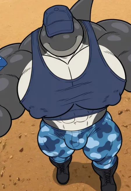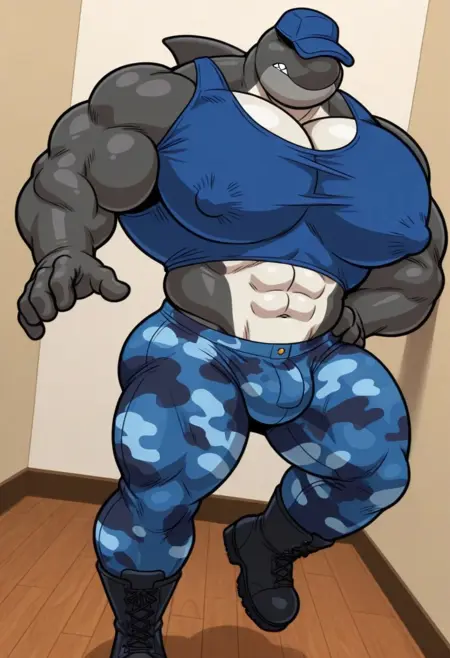옷 프롬프트: "blue tank top, crop top, midriff, blue cap, blue camouflage pants, black boots"