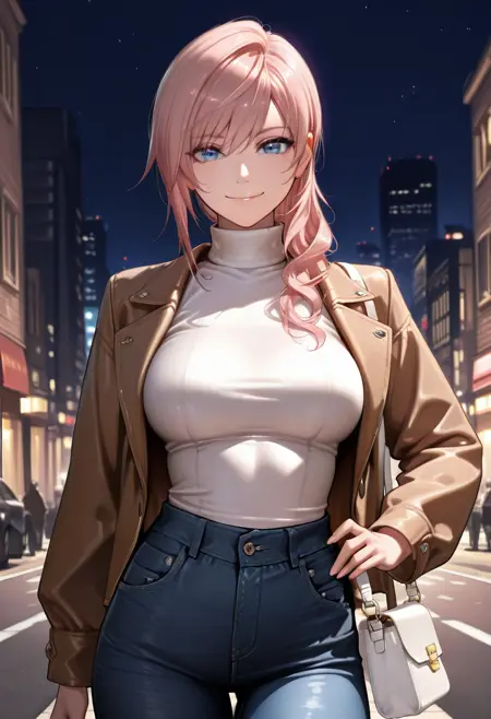 "LGHTFARN、ピンクの髪、非対称な髪、肩までの髪、青い目、ノースリーブジャケット、タートルネック、肩甲板、茶色のスカート、非対称な袖、片方の黒い袖、アームレット、フィンガーレスグローブ、太ももポーチ"