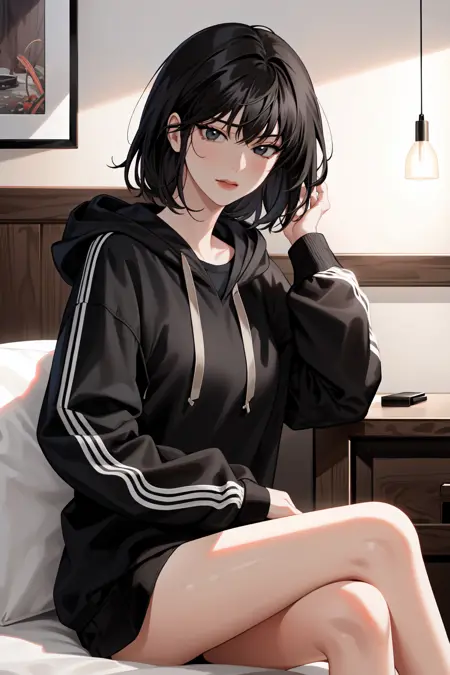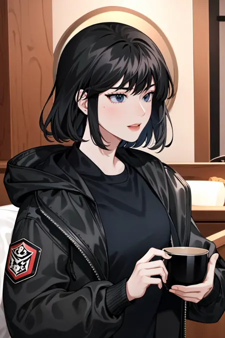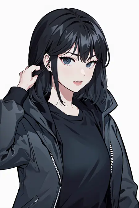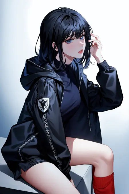连帽衫:han sooyoung, 1girl, 刘海, 黑色夹克, 连帽, 连帽衫, 黑色衬衫, 长袖