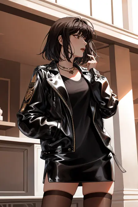 皮夹克:han sooyoung, 1girl, 项链, 刘海, 皮夹克, 长袖, 过膝靴