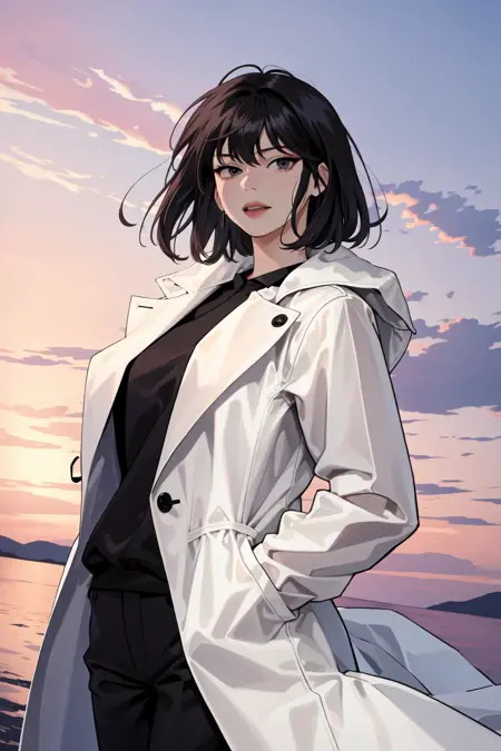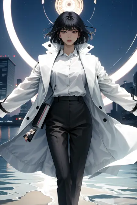 外套:han sooyoung, 1girl, 刘海, 白色外套, 黑色衬衫, 长袖, 裤子
