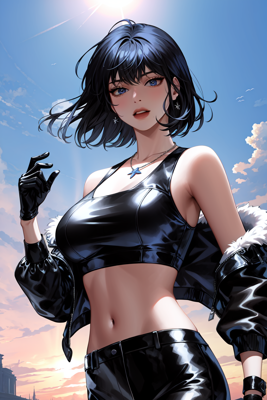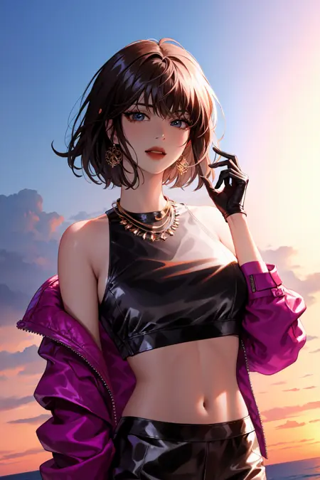 露脐装:han sooyoung, 1girl, 手套, 夹克, 项链, 露脐装, 露肩