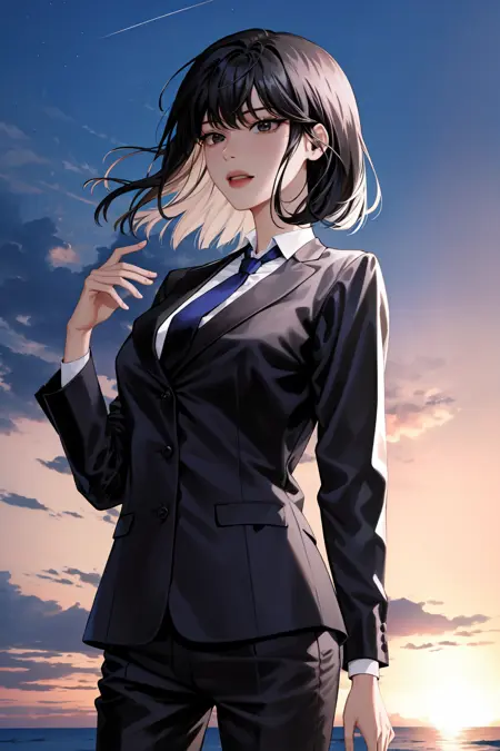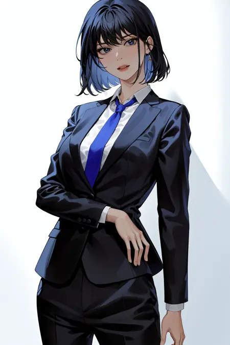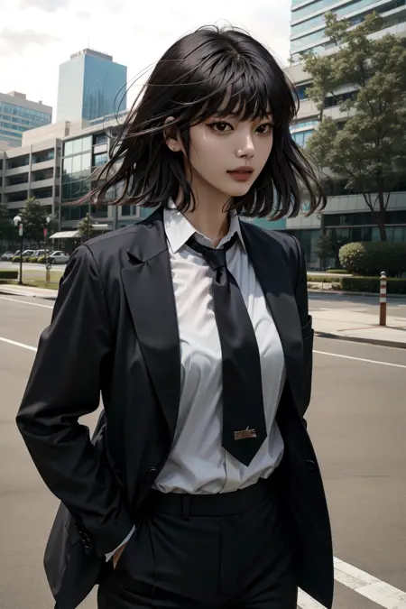 正式装:han sooyoung, 1girl, 黑色西装, 正式, 衬衫, 裤子, 刘海, 长袖, 领带