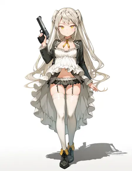 DeagleDef, def_frilled_dress, def_blazer, open blazer, def_detached_collar, def_neck_ribbon, frilled collar, def_skirt, def_thighhighs, def_garter_straps, def_sneakers, midriff,