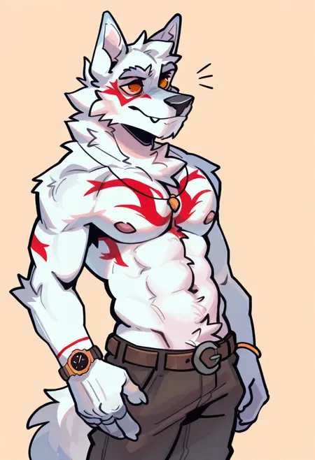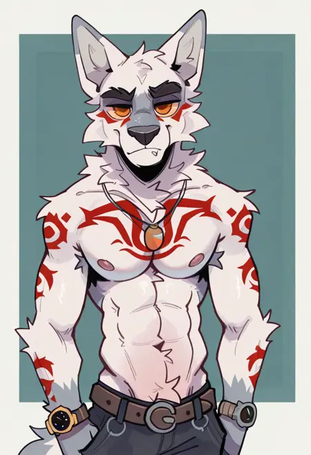 Illustrious: best quality, amazing quality, very aesthetic, absurdres, newest, digital drawing, 2D, f1etcher_k4ne, 1boy, male focus, solo, furry, furry male, orange eyes, white fur, jewelry, ...your tags...