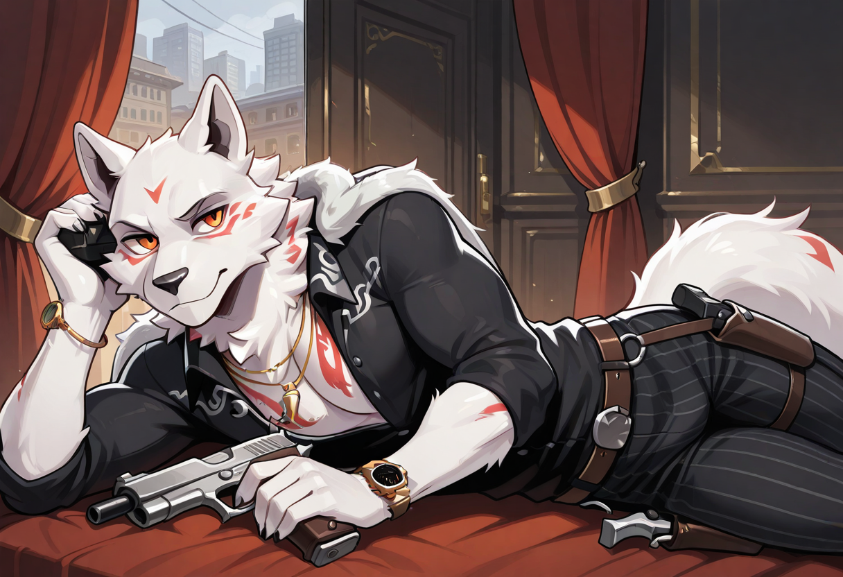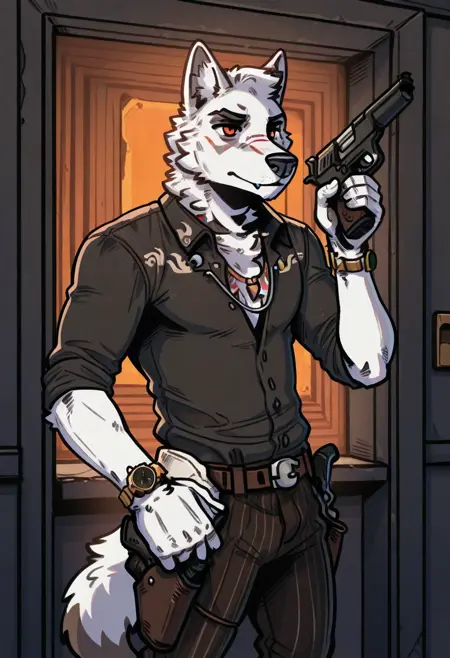 Pony: score_9, score_8_up, score_7_up, score_6_up, high res, best quality, f1etcher_k4ne, 1boy, male focus, solo, furry, furry male, orange eyes, jewelry, pectorals, wristwatch, brown belt, standing, curtains, holster, furry male, tail, pinstripe pattern, necklace, building, belt, white fur
