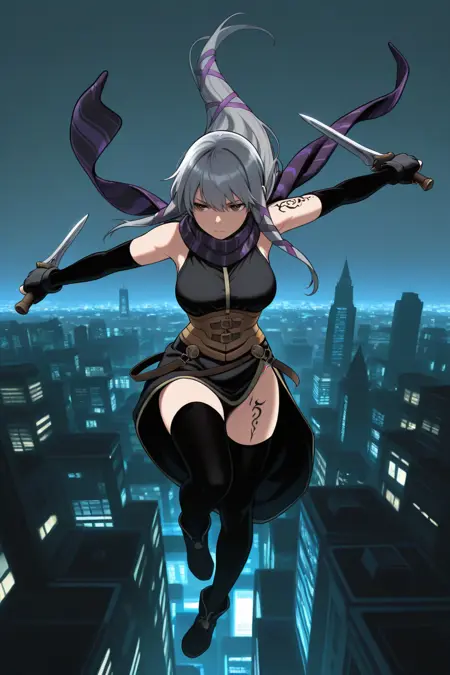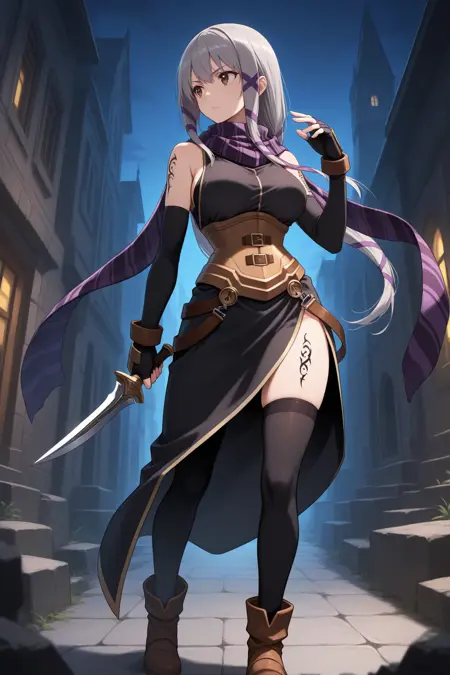 通常の外見には、「縞模様のスカーフ、黒いチュニック、ノースリーブ、コルセット、サイドスリット、肘までの手袋、黒い手袋、指なし手袋、黒いハイソックス、大きな胸、肩のタトゥー、足のタトゥー」を追加してください。