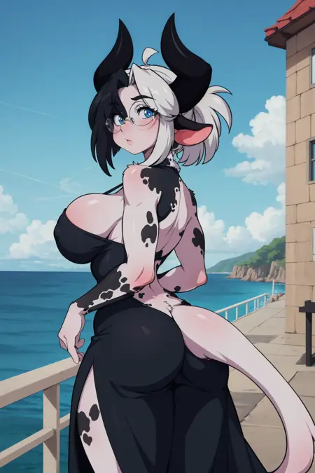 Trigger: "AlejandraColdthorn, furry, fur, snout, colored skin, cow girl" always needed for proper look, for accuracy add "blue eyes, cow tail, huge breasts".