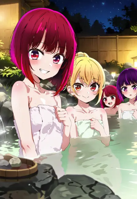 This model is trained onsens of anime style, multiple girls. I made the LoRA changes in wonderful composition of multiple girls as expected.