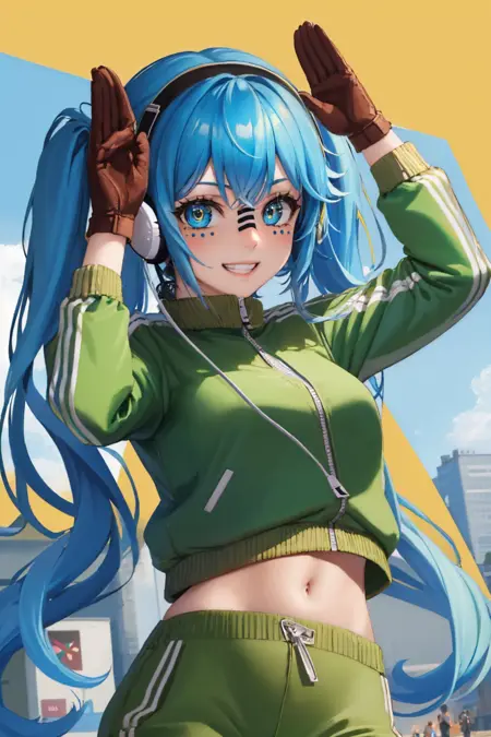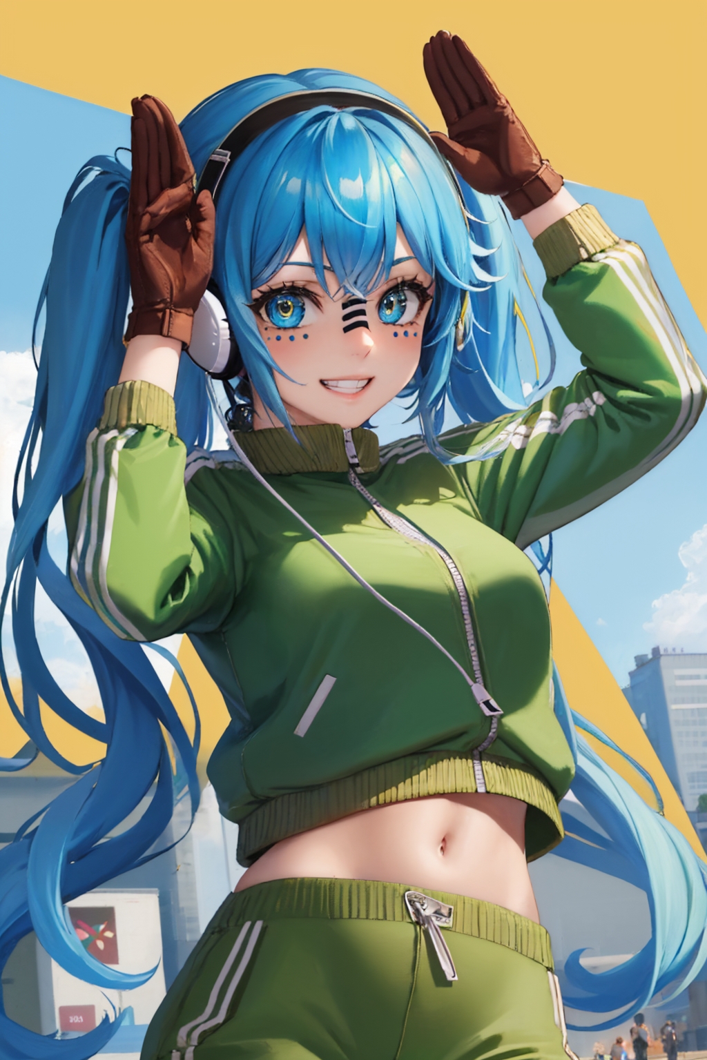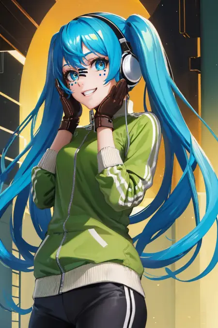 初音未来: matrymiku, 双马尾, 耳机, 绿色夹克, 运动夹克, 手套