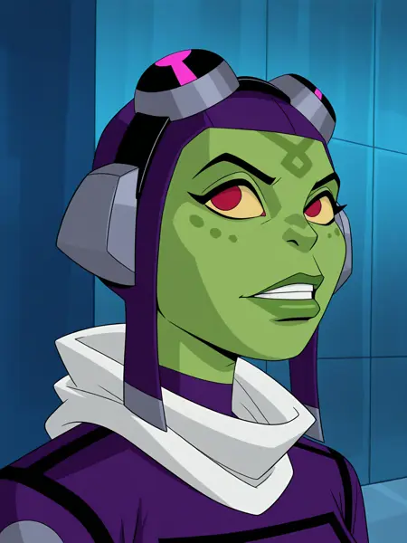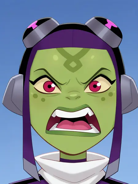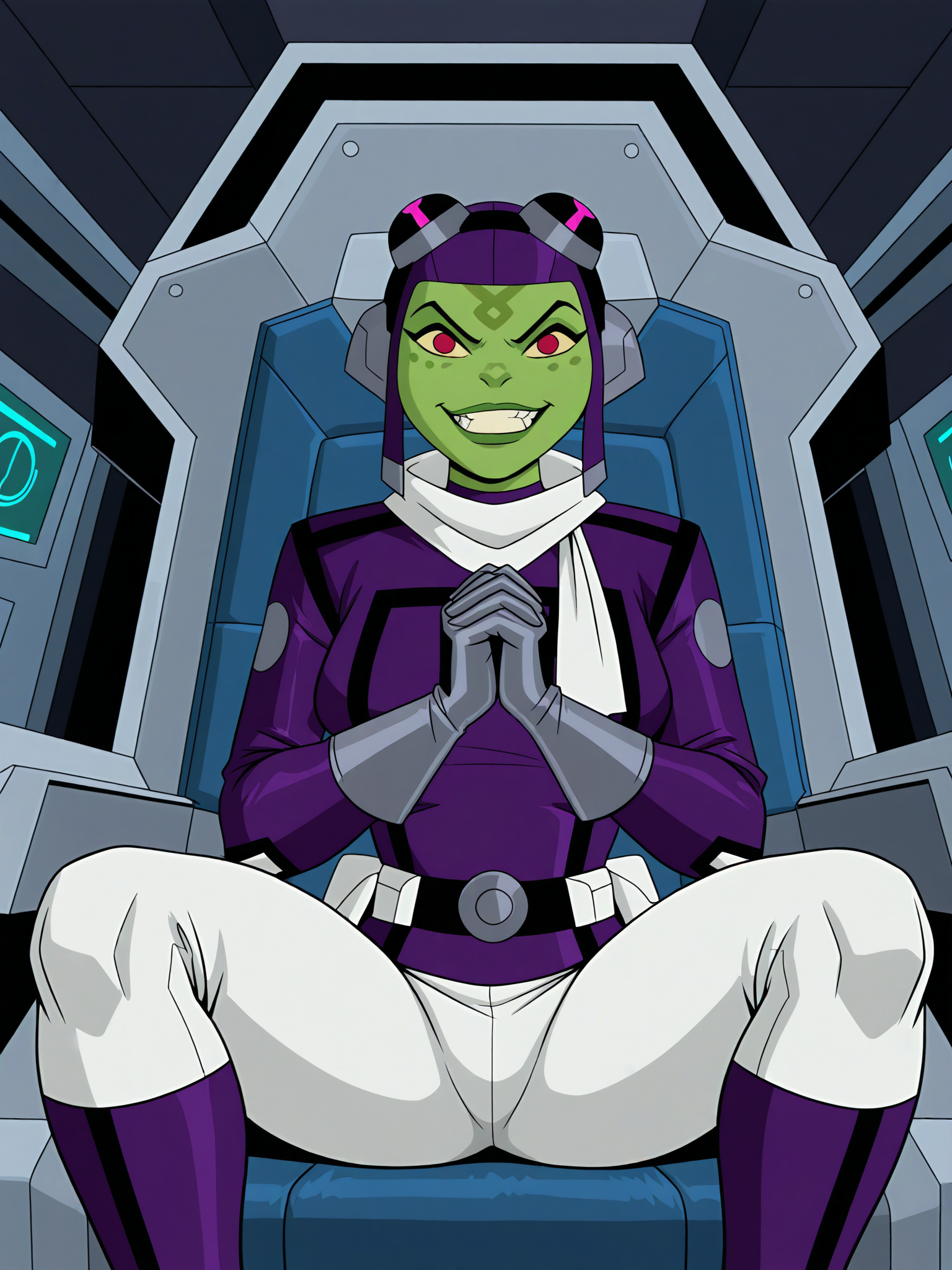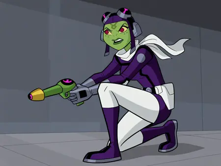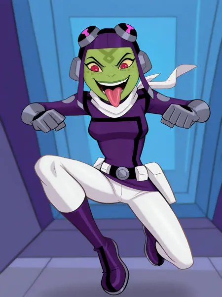 描述:兽人、青蛙女孩、绿色皮肤、额头印记、红眼睛、紫色头盔、头戴护目镜、白色围巾、紫色制服、手套、白色腰带、枪套、白色长筒袜、紫色靴子、手持射线枪