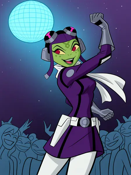 설명: 인트로, 개구리 소녀, 녹색 피부, 이마의 문양, 붉은 눈, 보라색 헬멧, 머리에 안경, 흰색 스카프, 보라색 유니폼, 장갑, 흰색 벨트, 총집, 흰색 레깅스, 보라색 부츠, 레이건 쥐고 있음